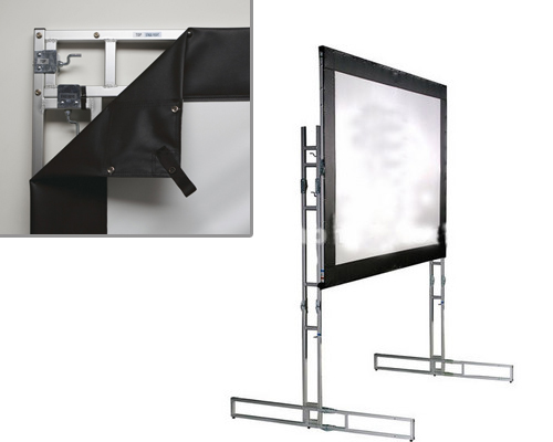 Todos los componentes forman parte duraderos estuches para el transporte y almacenamiento conveniente. Superficies de proyección frontal y posterior de la pantalla pueden ser intercambiados en cualquier momento. La pantalla se puede ajustar hacia arriba o hacia abajo en incrementos de 6 ". Incluye resistentes bolsas de transporte de polietileno.